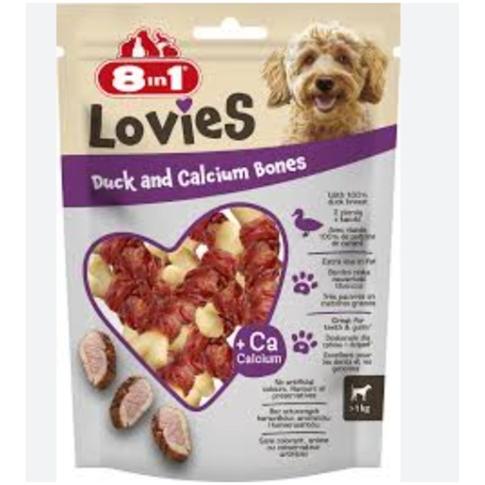 LOVIES 8in1 Kacsa és Kalcium Csontokban Kutya Jutalomfalat Kockák 80g – ropogós snack, amely támogatja az erős csontokat. A Lovies Kacsa és Kalcium Csontokban finom sült kacsamell és ropogós, kalciummal