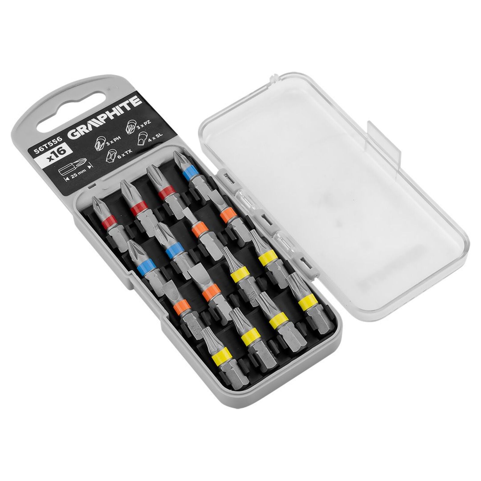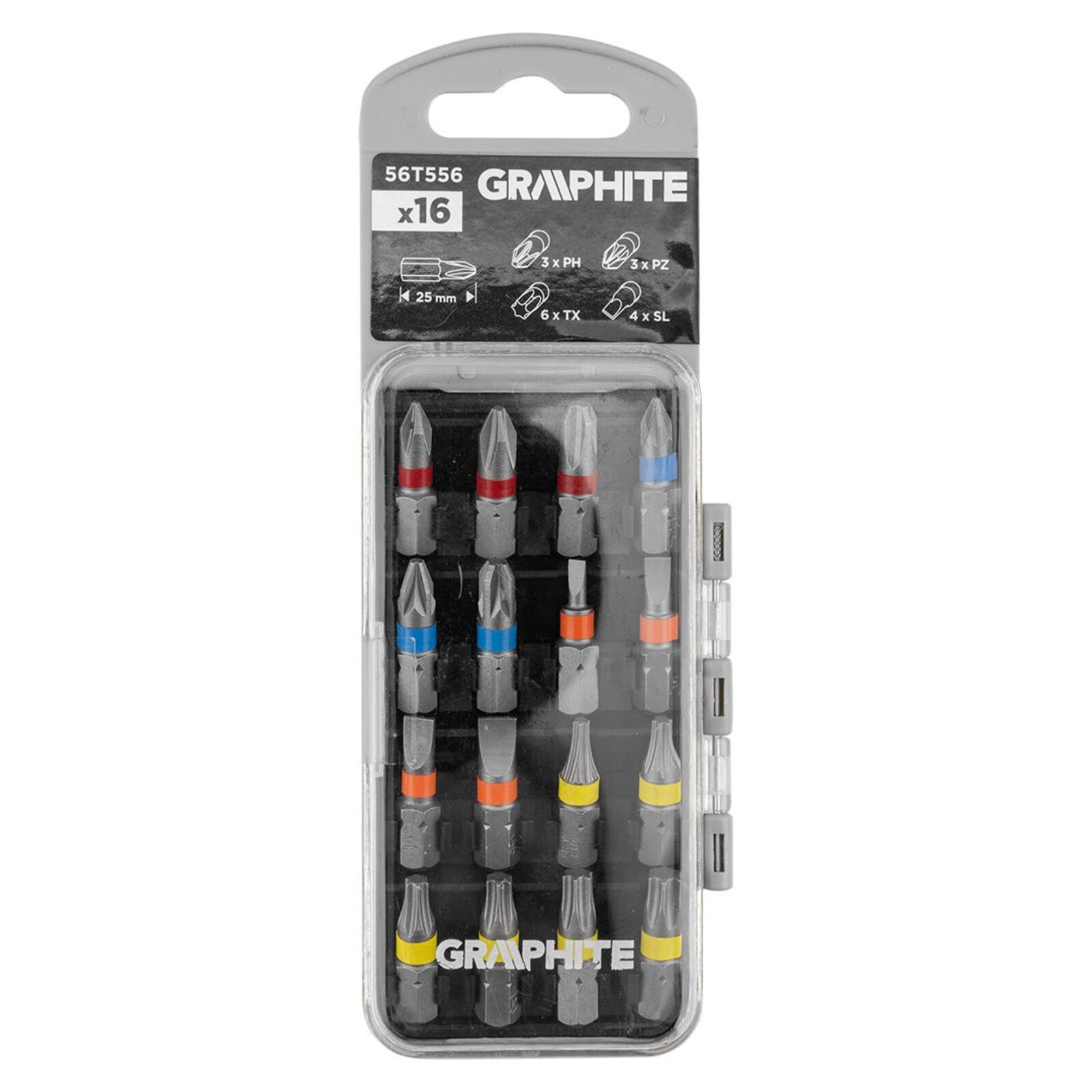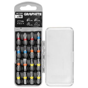 SL3/4/5/6, PH1/2/3, PZ1/2/3, PZ1/2/3, PZ1/2/3, TX10/15/20/25/27/30 x 25 mm, 16 darab 56T556 a GRAPHITE által 16 darab bitből áll: SL3, SL4, SL5, SL6, PH1, PH2, PH3, PZ1, PZ2, PZ3, TX10, TX15, TX20, TX25, TX27, TX30, 25 mm hosszúságú. Minden tartozék 1/4"-os hatlapos fogantyúval rendelkezik, és kemény króm-vanádium acélból (CrV) készült - így biztosítva a sokoldalúságot és a megfelelő tartósságot a használat során.