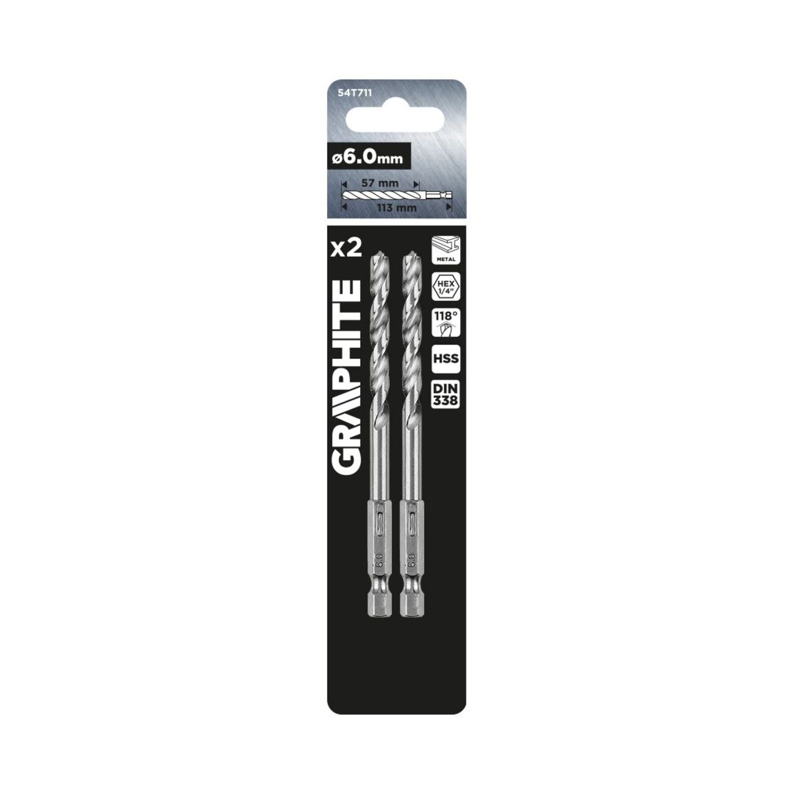 GRAPHITE Csigafúró, 1/4" hatszög szárral, HSS DIN 338, 6 mm, 2db/cs. Fúrókészlet fémek megmunkálásához. 6 mm átmérő, 113 mm teljes hossz, 57 mm munkahossz jellemzi. Megfelel a DIN 338 szabványnak, és 118 fokos élszöggel rendelkezik. A fúrók profi és amatőr alkalmazásban is jól működnek.