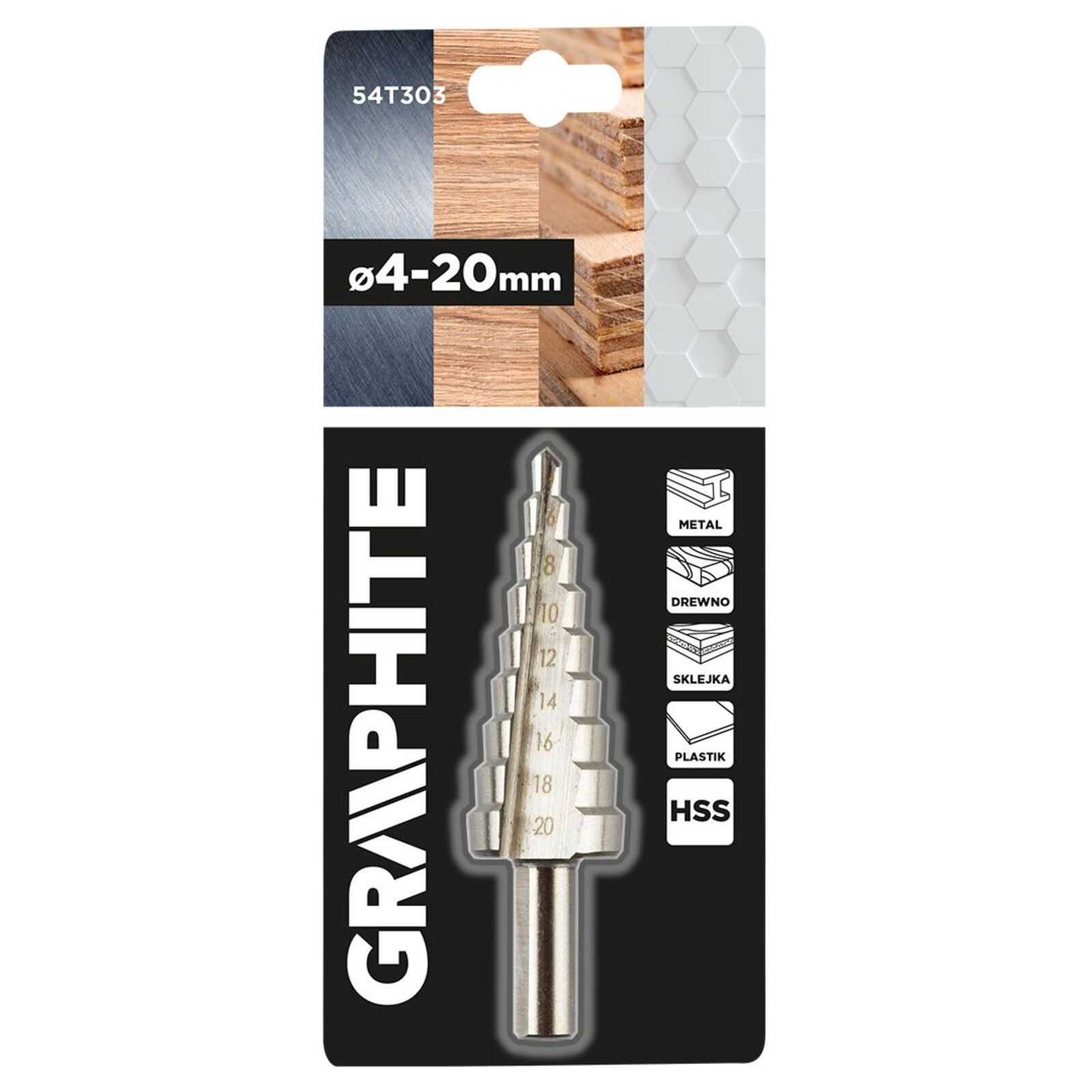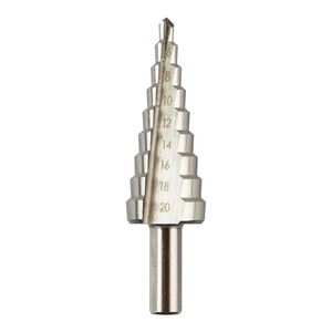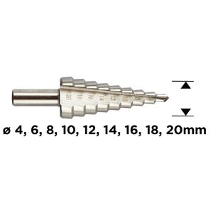 GRAPHITE 54T303 Lépcsős fúró, HSS, 4-20mm. Segítségével 4 és 20 mm közötti átmérőjű furatokat készíthet. Tökéletes szerszám fémlemez, műanyag és fa megmunkálásához. Profi és hobbi használatra egyaránt ajánlott.