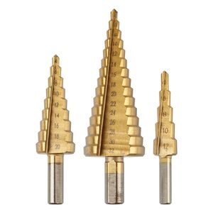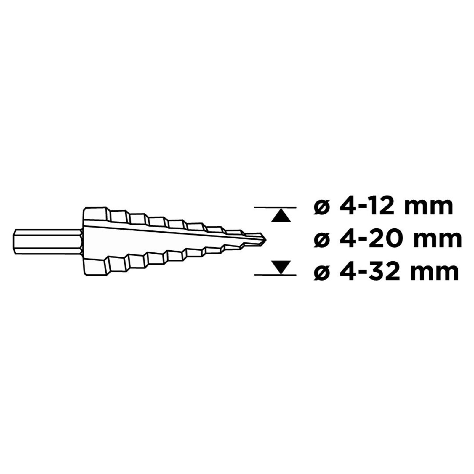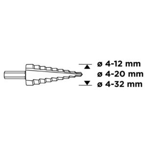GRAPHITE 54T300 Lépcsős fúró készlet, 3db-os, HSS-titán, 4-12mm, 4-20mm, 4-32mm.3 darab fúrót tartalmaz, amelyek kiváló minőségű HSS acélból készültek. A szerszámok fémlemez és műanyag megmunkálásakor alkalmazhatóak.