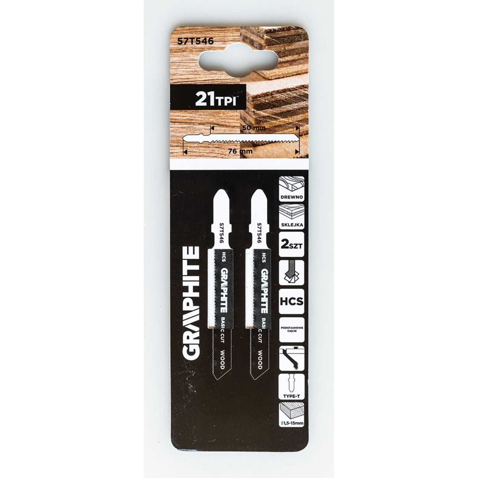 Kirakófűrészlap, 21 TPI, HCS, T-markolat, 2 db 57T546 a GRAPHITE-tól 21 TPI fogsűrűségű, HCS-ből készült, T-markolattal ellátott kirakófűrészlap. A készlet 2 darabot tartalmaz. Teljes hossza 76 mm, munkahossza 50 mm, szélessége 8 mm, vastagsága 1 mm, fogazati távolsága 1,2 mm. Alkalmas puhafa (1,5-15 mm), rétegelt lemez, forgácslap, asztalos rétegelt lemez és farostlemez vágására. A GRAPHITE márkájú penge alapvető vágást tesz lehetővé.