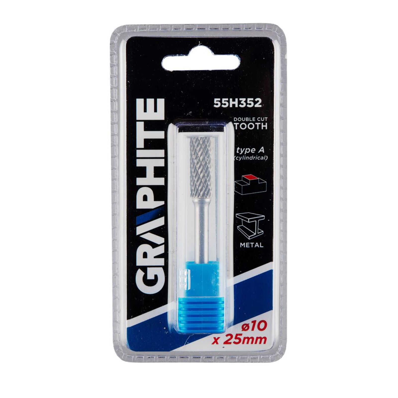 Keményfém marófej, A típusú (hengeres), 10 x 25 mm, 55H352, GRAPHITE - kiváló minőségű, a megmunkálandó felület marására vagy vágására szolgáló szerszám. Fém, alumínium és műanyag megmunkálására tervezték. Egyenes csiszolókkal használható (ne használja fúróval).