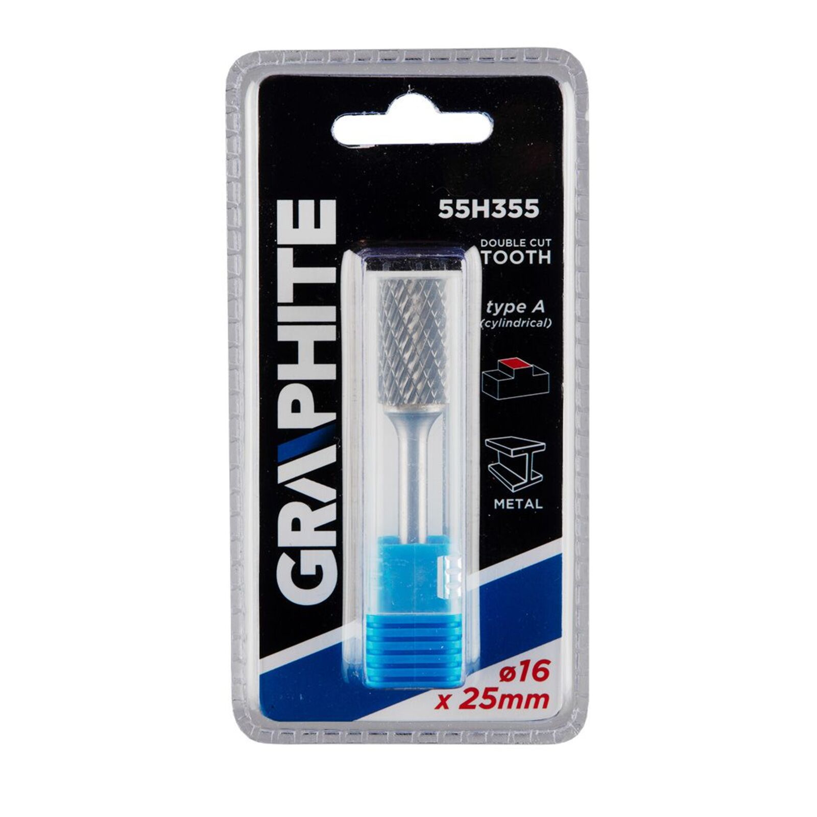 Keményfém marófej, A típusú (hengeres), 16 x 25 mm, 55H355, GRAPHITE - kiváló minőségű, a megmunkálandó felület marására vagy vágására szolgáló szerszám. Fém, alumínium és műanyag megmunkálására tervezték. Egyenes csiszolókkal használható (ne használja fúróval).