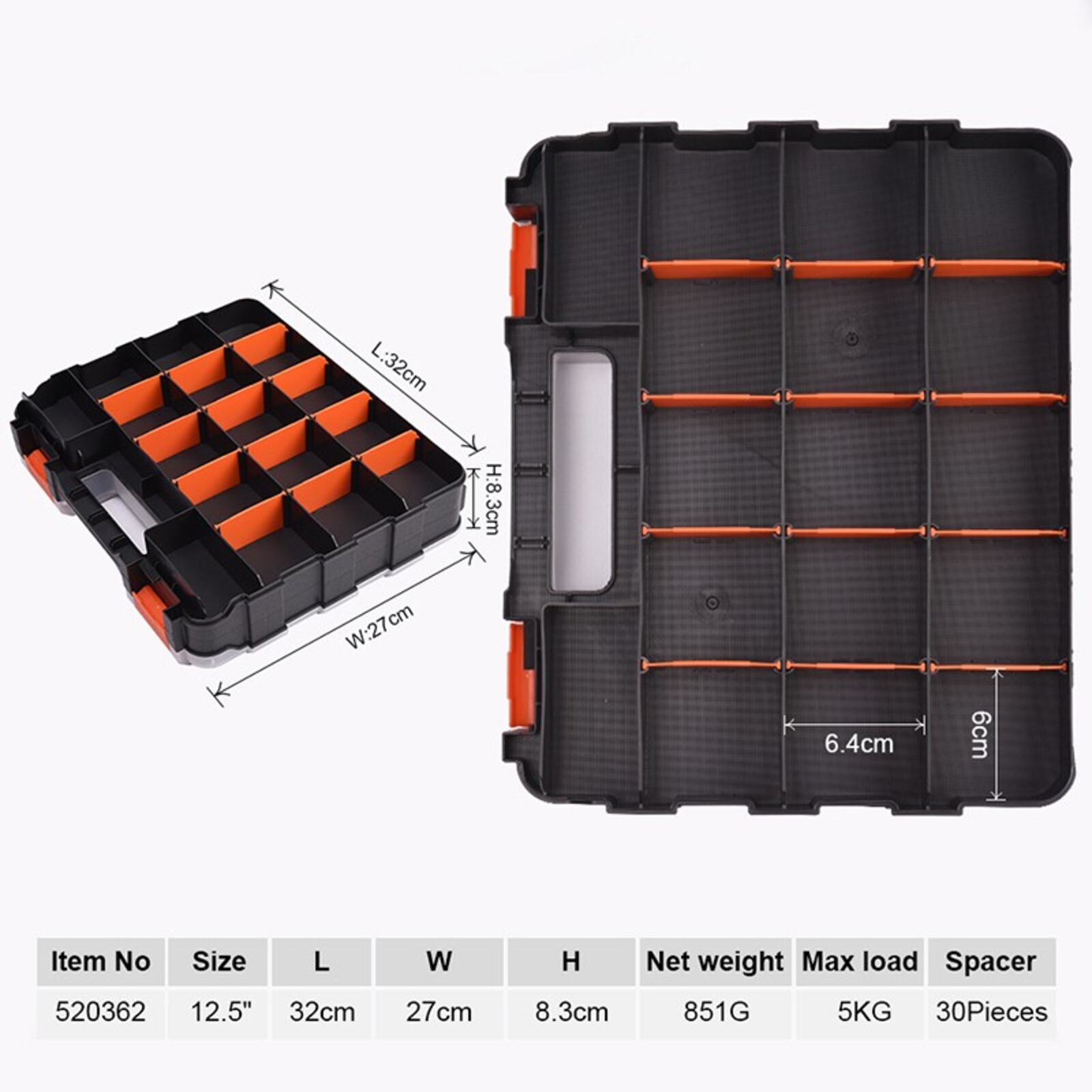 Műanyag két oldalas szortimenter, egy oldalon 17 rekesz. Max teherbírás: 5 kg. Méret: 320x270x83mm