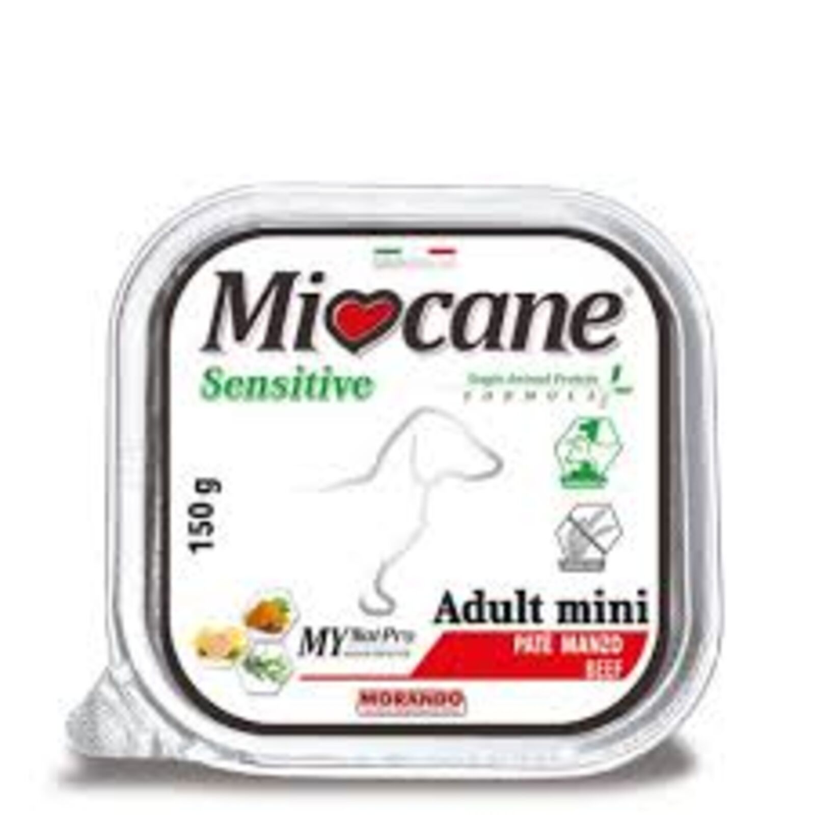 A Miocane Sensitive patè gabonamentes és 100% állati fehérjét tartalmaz, amely ideális az érzékeny bőrű és bélrendszerű, kisméretű felnőtt kutyáknak.