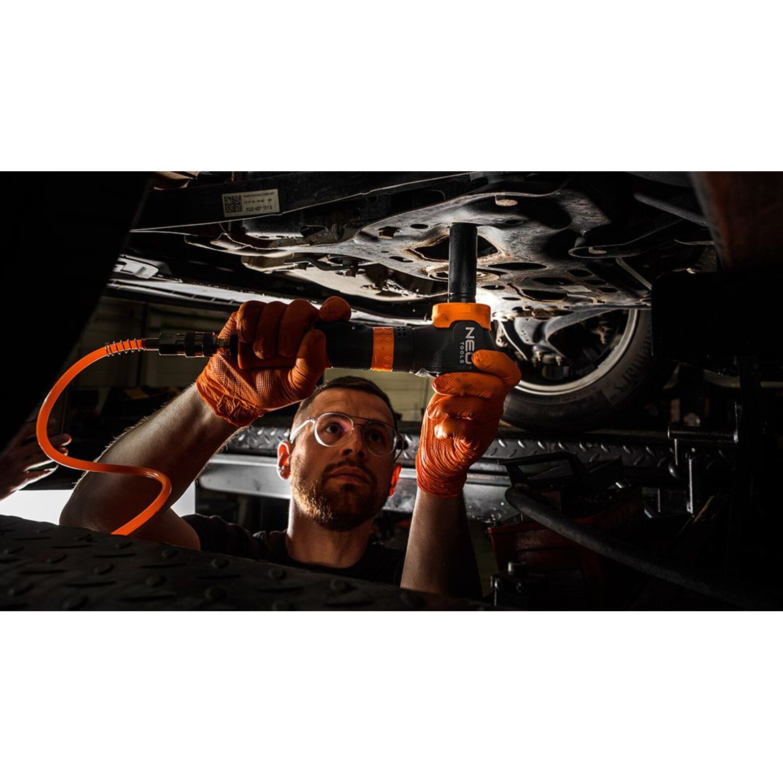 NEO Pneumatikus sarok-ütvecsavarozó . 1/2", 500 Nm, 6,3 bar maximális üzemi nyomás, átlagos levegőfogyasztás 113 l/perc. A kulcs percenként 75 000 fordulatszámot ér el. Könnyű, 1,17 kg-os súlya és praktikus formája hozzájárul a munka megkönnyítéséhez, nehezen hozzáférhető helyeken is. Műhelymunkákhoz ajánlott. A NEO márkájú termékek minőségét a CE tanúsítvány tanúsítja.