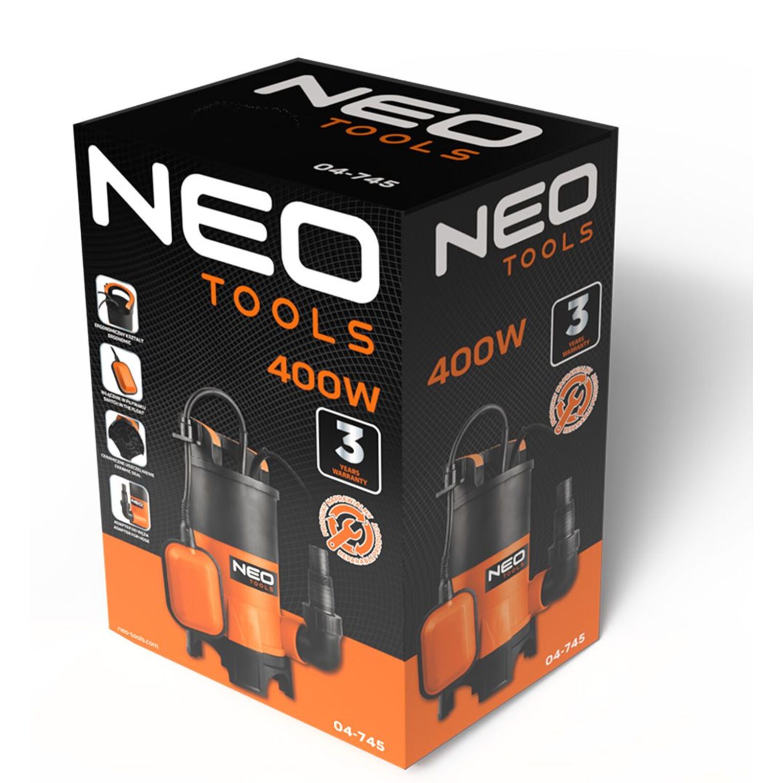 A NEO TOOLS 04-745 szennyezett víz búvárszivattyú 400 W, teljesítmény 8000 l/h a NEO TOOLS praktikus eszköze a víz kiszivattyúzásához épületekből vagy pincékből, valamint a vízkivételekből (pl. kutakból) a célállomásokra történő vízszállításhoz. Jellemzője a 400 W teljesítmény és a 8 000 l/h kapacitás. A NEO TOOLS szivattyú maximális merülési mélysége 5 m, a maximális vízemelkedés pedig 7 m. A készülék a szivattyúzás után 30 mm vizet hagy, és a kezelt szennyeződések legnagyobb lehetséges átmérője nem haladhatja meg a 25 mm-t. A NEO TOOLS merülőszivattyú alumíniumból (motorház), valamint üvegszál-erősítésű nejlonból (a fő ház esetében) készül. A maximálisan támogatott vízhőmérséklet 35 Celsius fok. A készülék kerámia orsótömítéssel és hosszú, 10 méteres gumiból készült tápkábellel is rendelkezik. Támogatja a ∅25, ∅32, 1", 1 ½" átmérőjű csapokat. A NEO TOOLS márka szennyezett vizes merülőszivattyúja hasznos megoldás az építkezők, vízvezeték-szerelők, gazdálkodók, valamint mindazok munkájához, akiknek rövid idő alatt nagy mennyiségű vizet kell kiszivattyúzniuk.