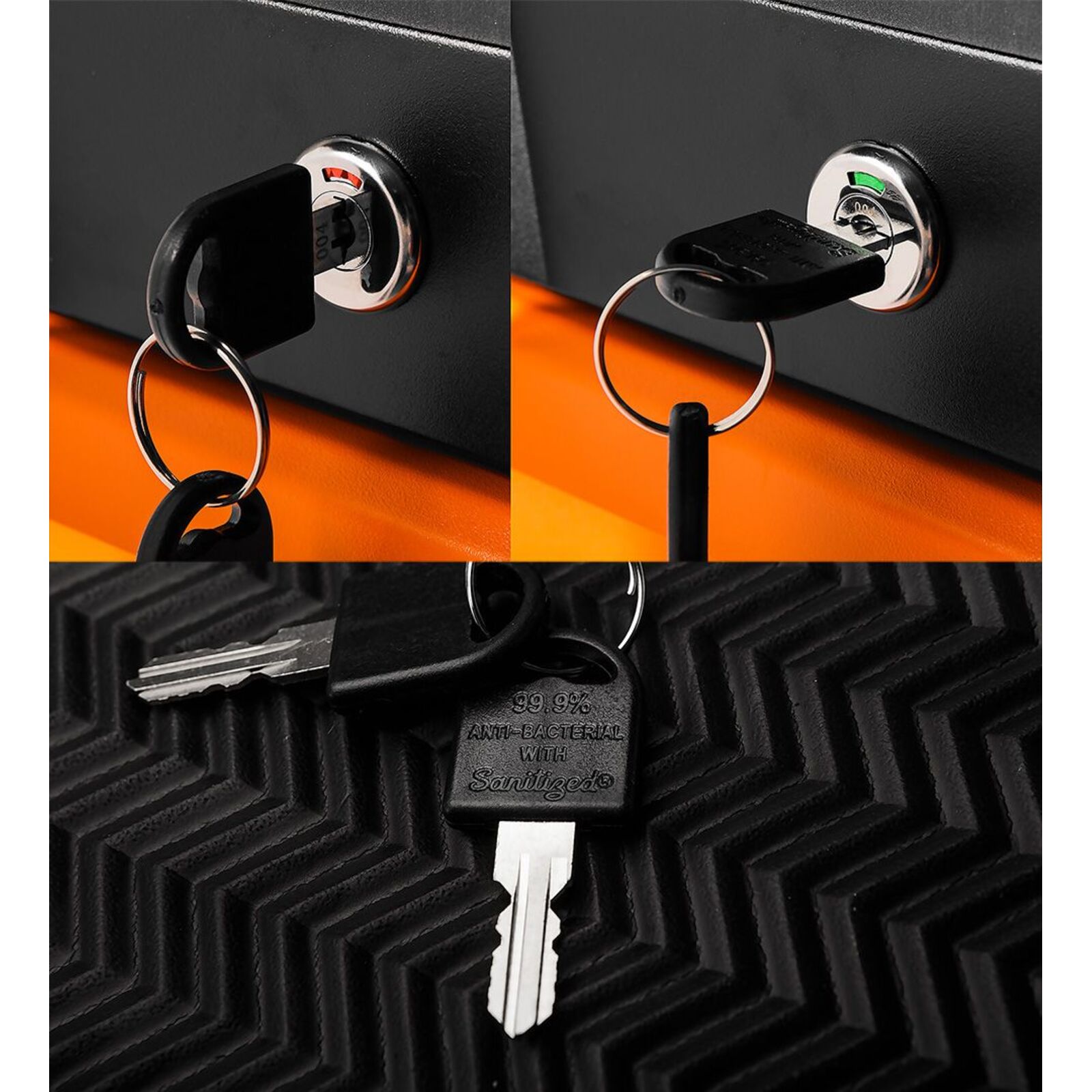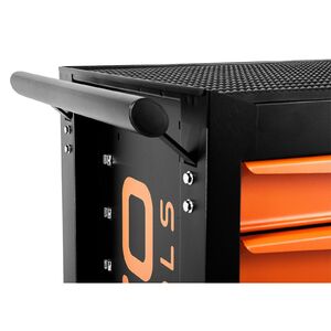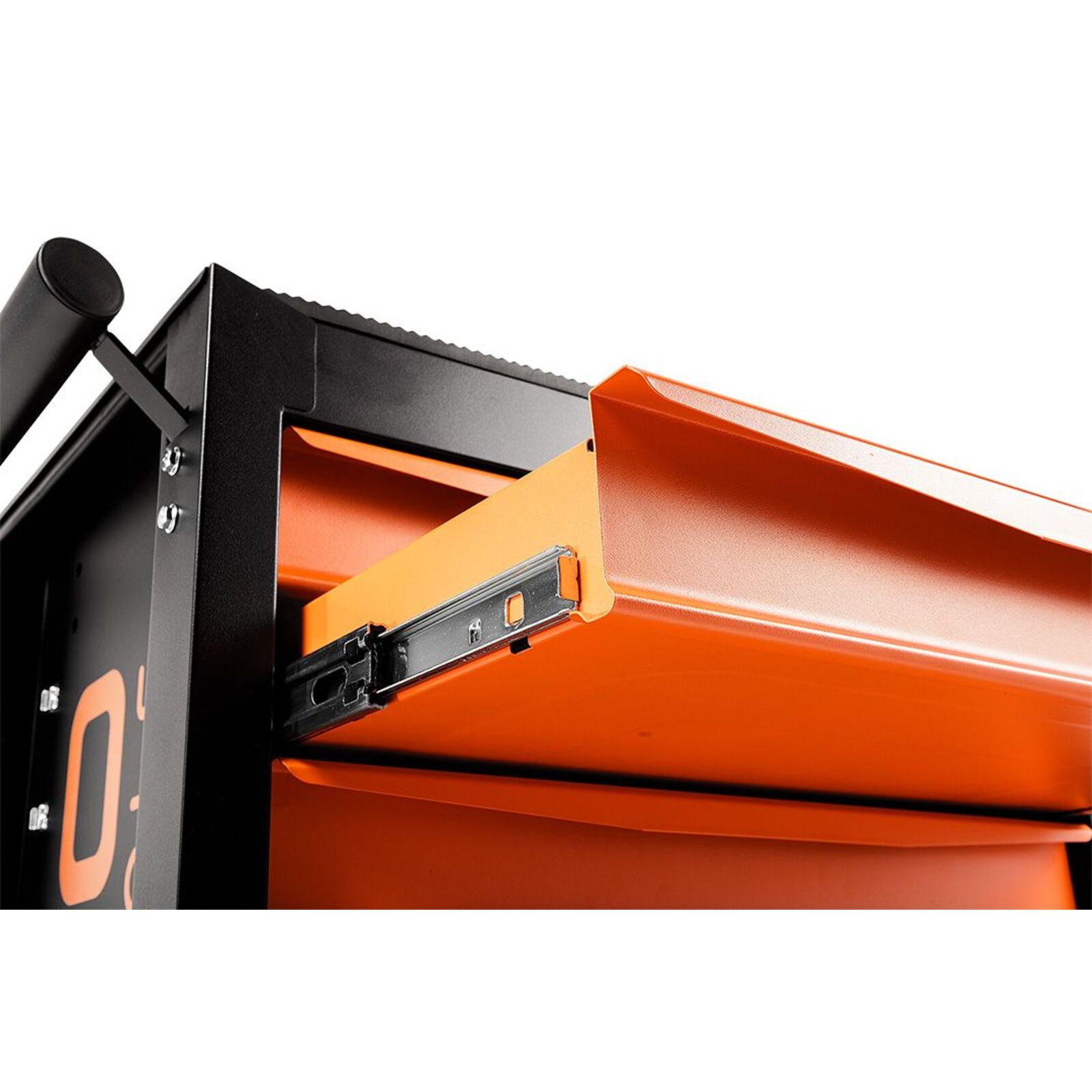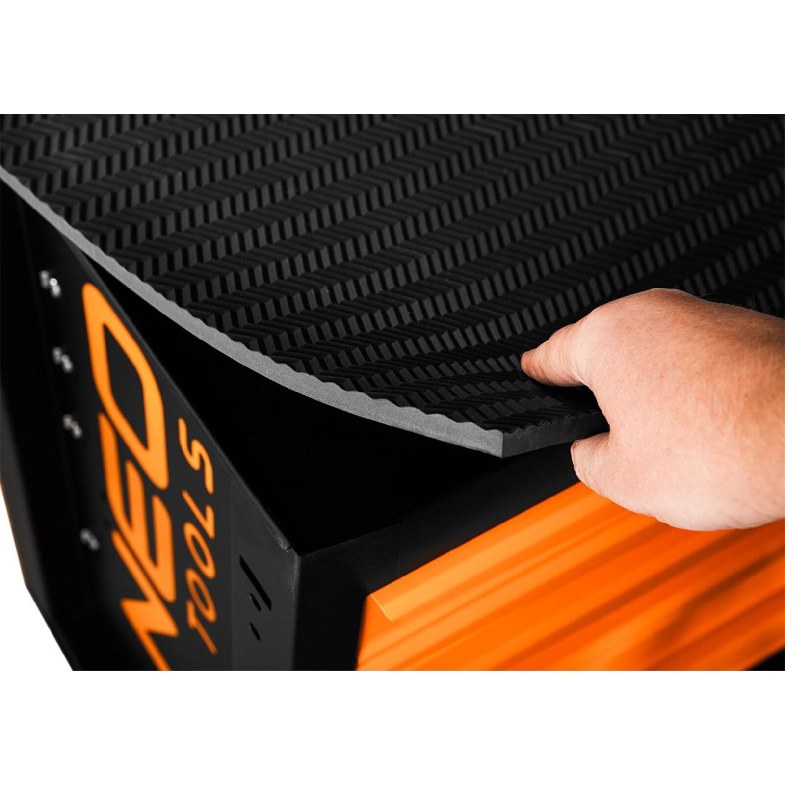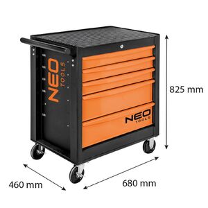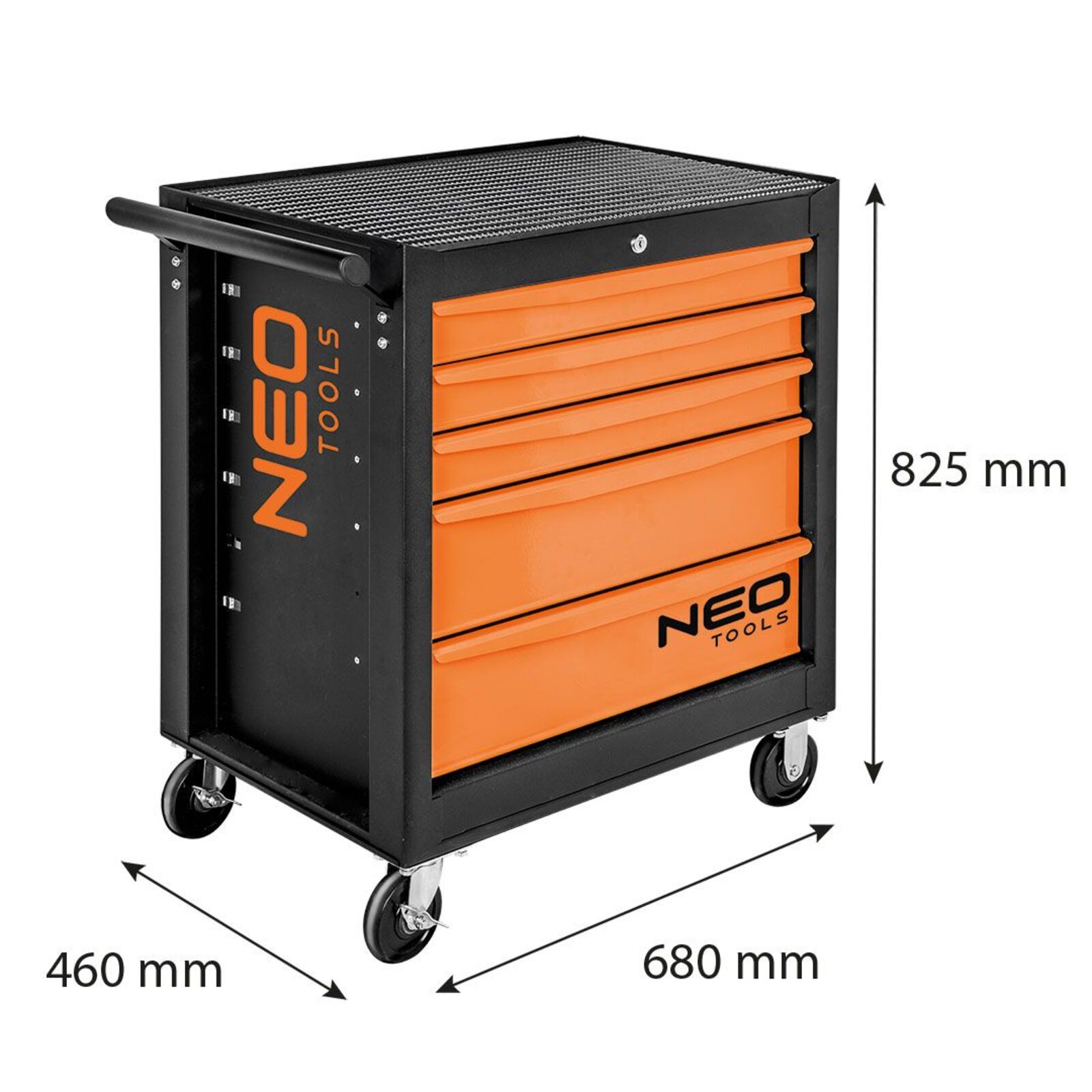 NEO 84-214 Műhelykocsi, 5 fiókos, 680x460x825mm, szerszámkocsi. A kocsi 5 praktikus szerszámtartó fiókot tartalmaz, melyek központi zárral zárhatók. A fiókok teljesen kihúzhatóak, vezető görgőn mozognak, amelyek biztosítják a hosszú élettartamot és a folymatos és üzembiztos működést. A munkapad felület gumi burkolattal van ellátva, mely ellenáll az olaj és az egyéb kenőanyagok behatásainak. A négy colos forgóvillás görgők megkönnyítik a kocsival történő manőverezést, egyben blokkolhatók is. Terhelhetősége 280 kg. A kocsi a vezetést segítő fogantyúval is ellátásra került.