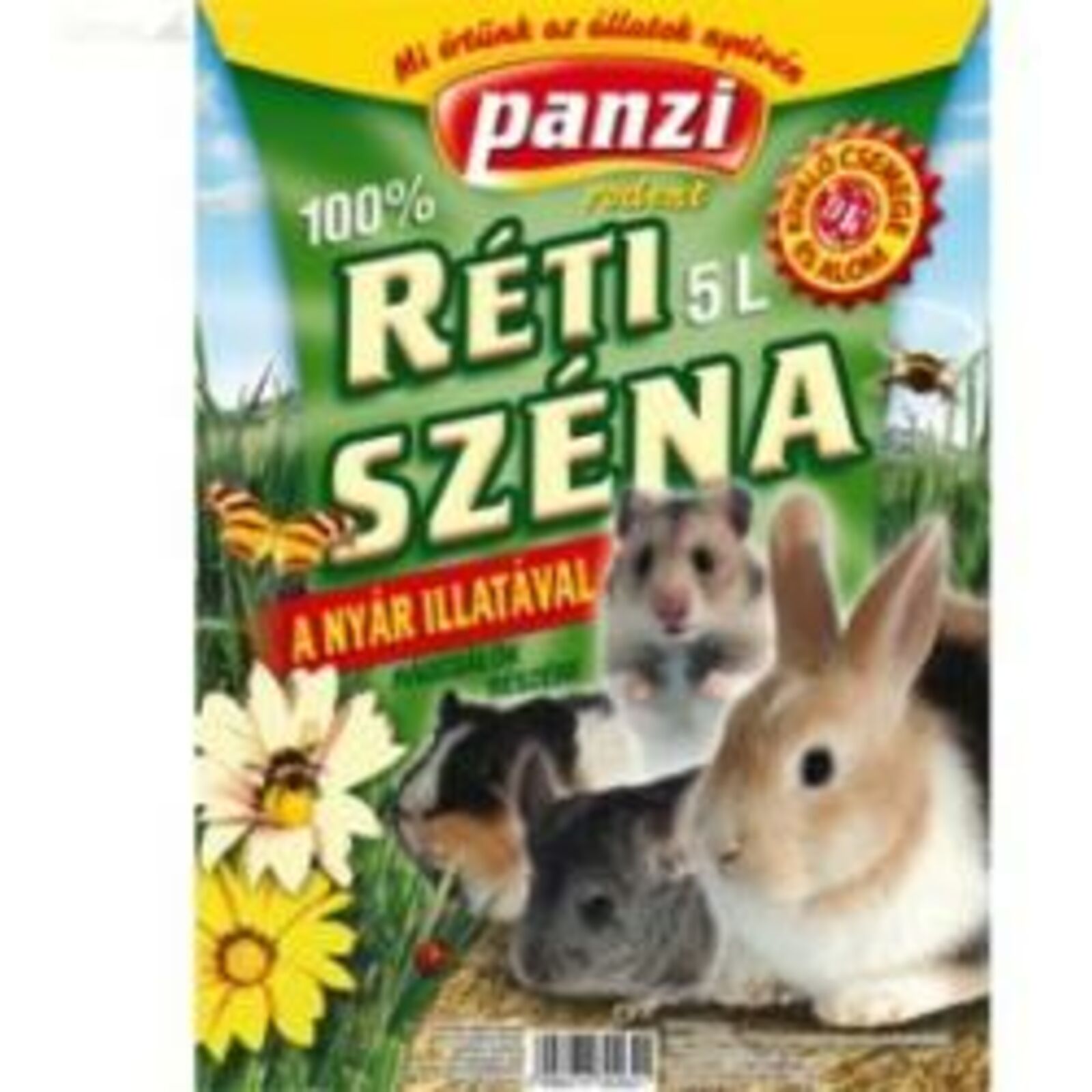 A Panzi Réti Széna – kézzel kaszált, napon szárított, vegyes fűvekből gyűjtött, magas tápértékű csemege és kiváló alom műanyag zacskóban.